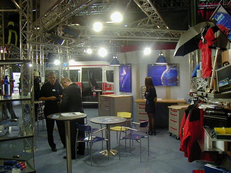 | Aproveché de sacarle fotos a nuestros vecinos. A la izquierda estaba Geko Eisemann, a nuestra derecha el Stand ruso y al frente el Stand de Sortimo en el que trabajaba Hellmuth Haller. |